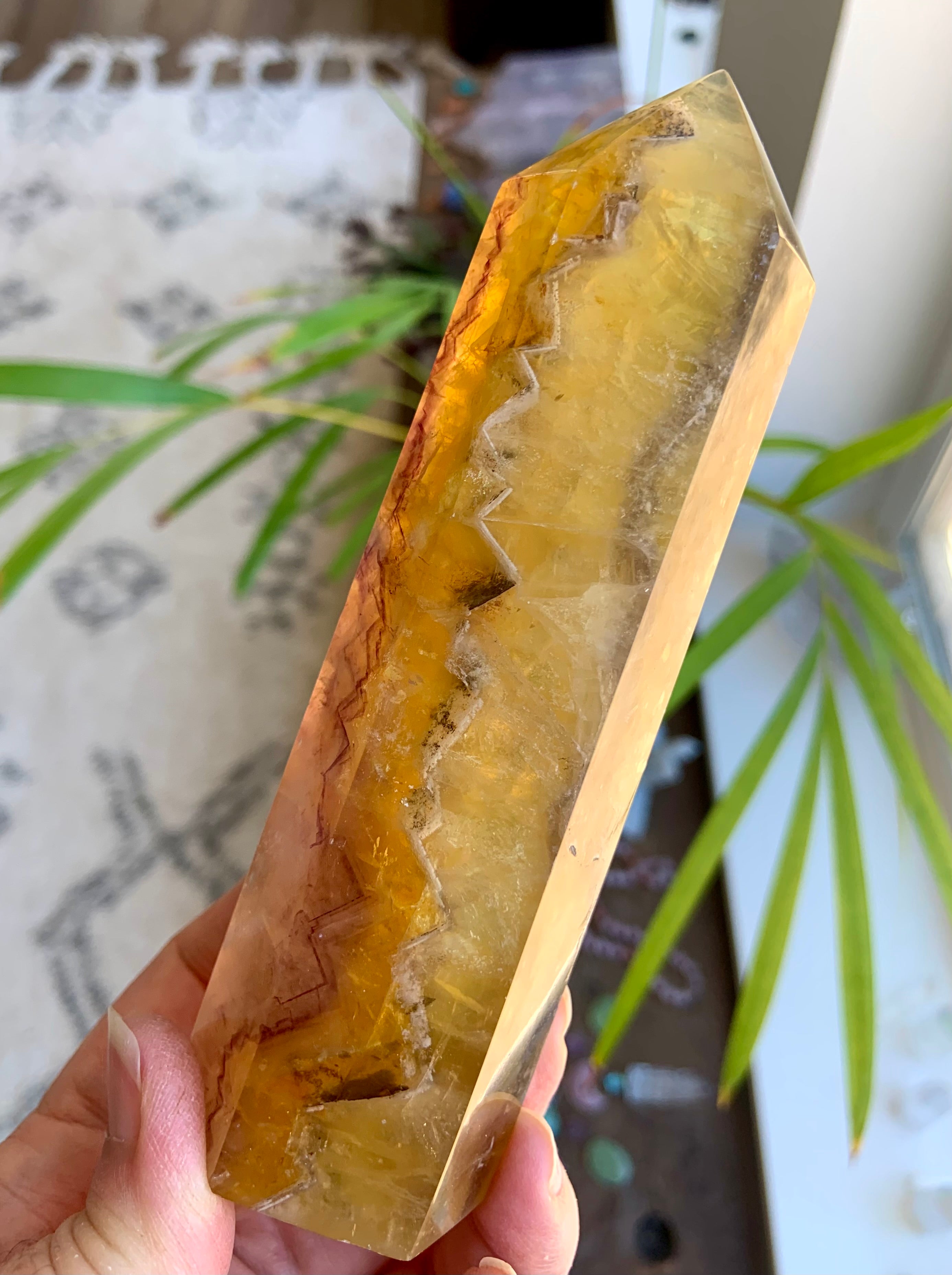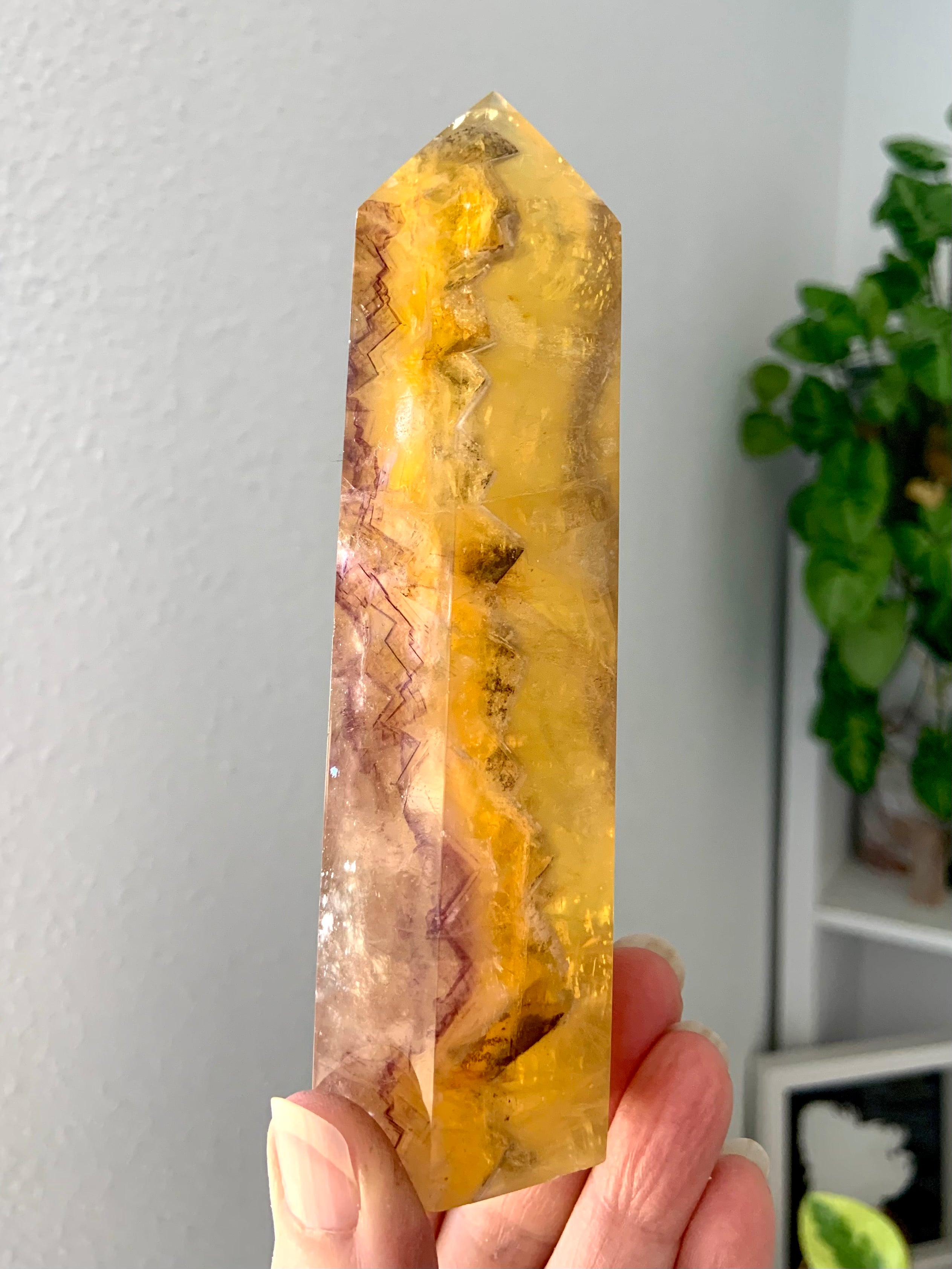 A gorgeous specimen with multiple well-formed cubic phantom zigzag patterns running up the tower. This unique polished fluorite crystal has such a dreamy, luminous quality that will bring cosmic magic to your crystal home decor + elevate your sacred space.