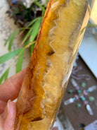 Yellow Fluorite has a joyful energy that bringing a sense of vitality + an optimistic outlook on life. Yellow Fluorite resonates with the solar plexus + can boost creativity + your sense of self-confidence. Fluorite with mica inclusions brings an element of reflection into your personal + spiritual growth.