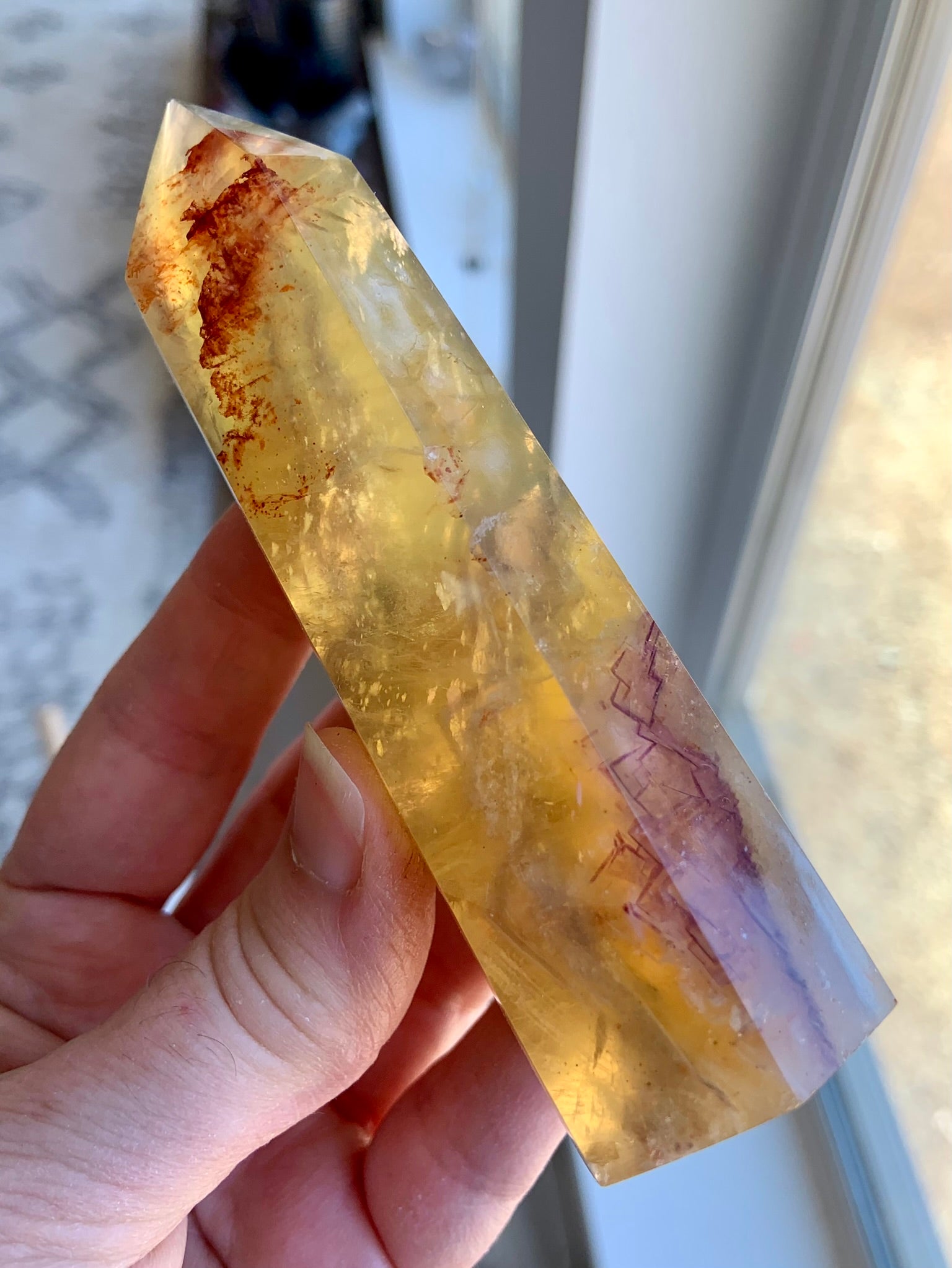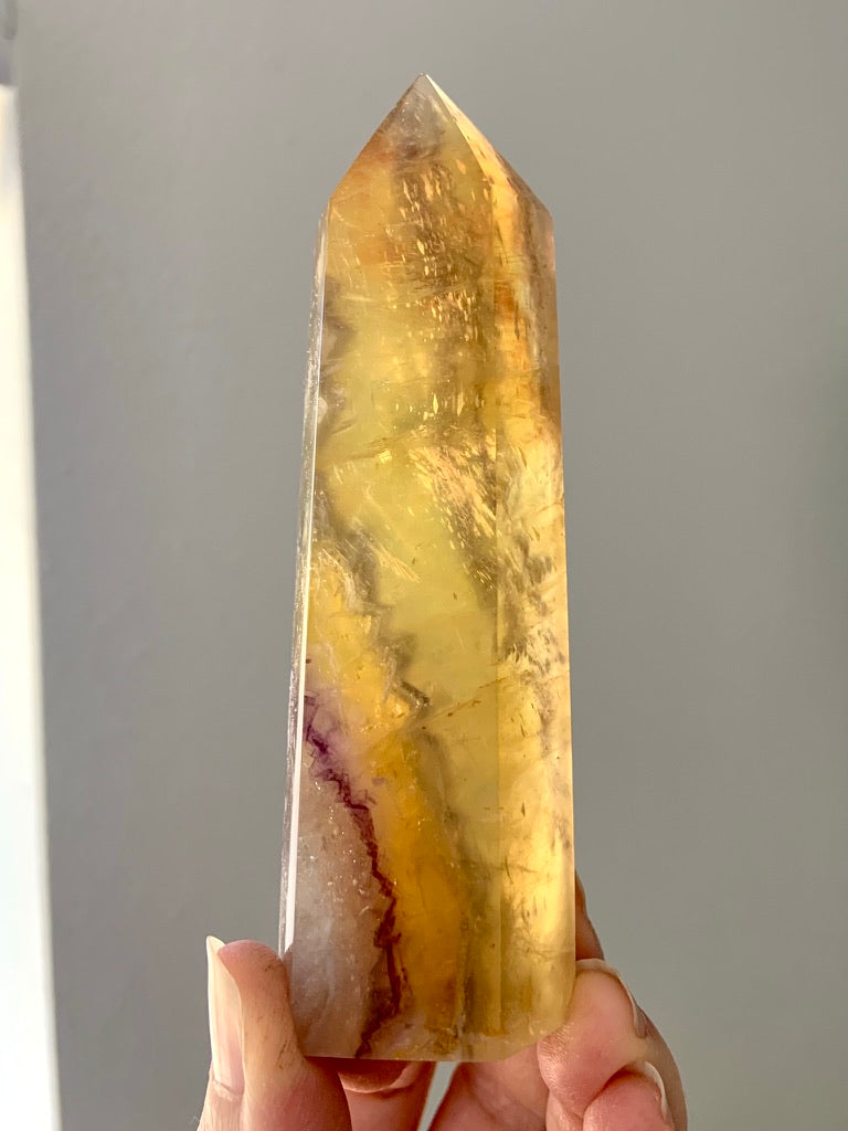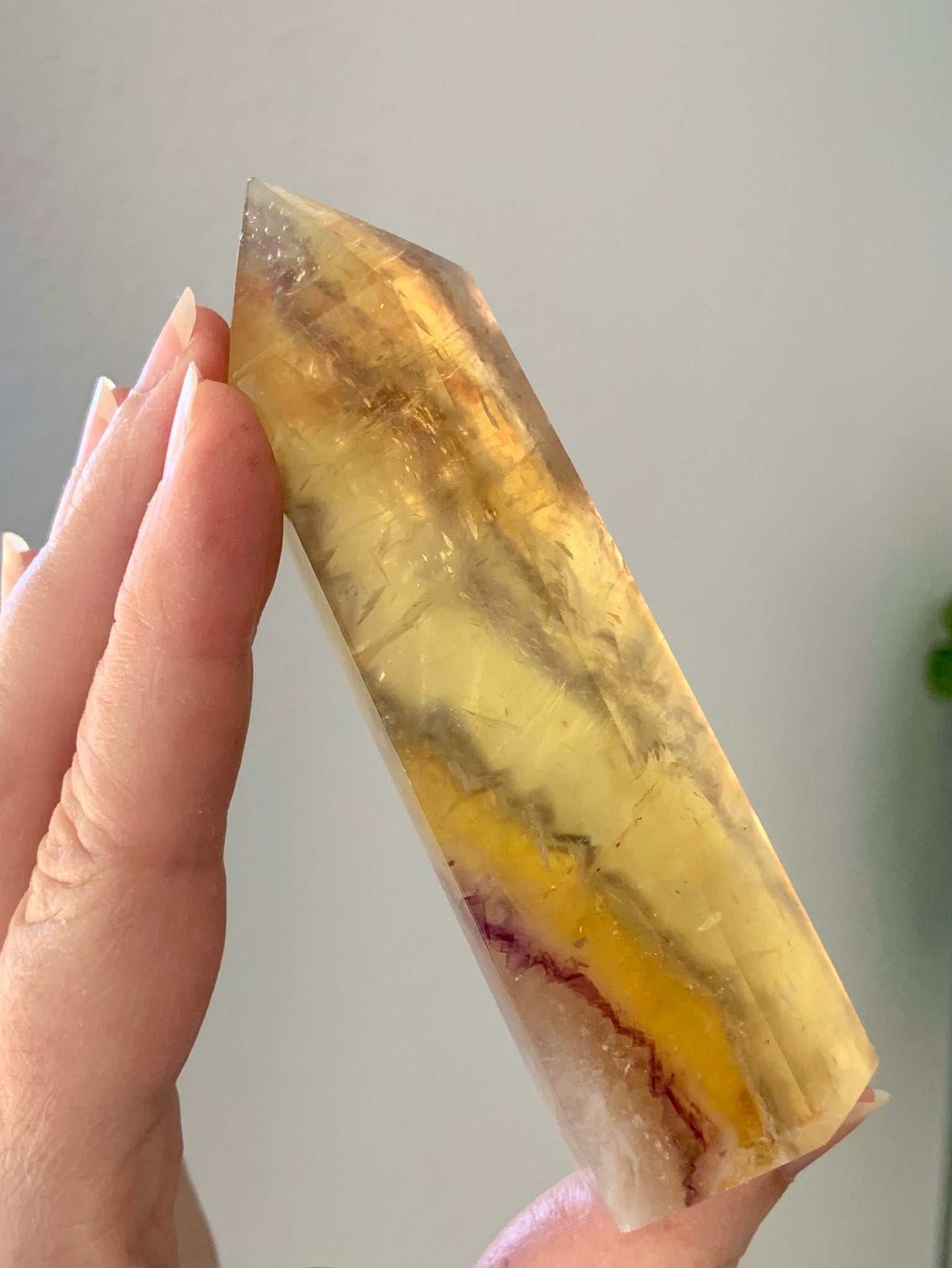 A gorgeous polished fluorite tower with multiple well-formed cubic phantom zigzag patterns running up the tower. This unique polished fluorite crystal has such a vibrant, uplifting energy that will bring cosmic magic to your crystal home decor + elevate your sacred space.