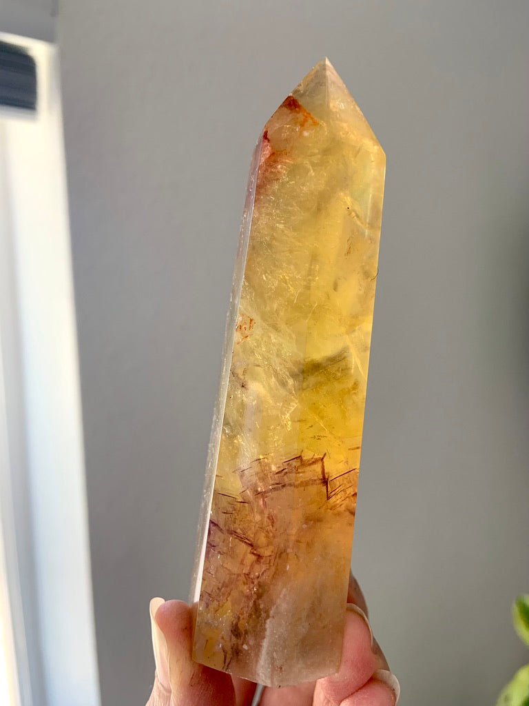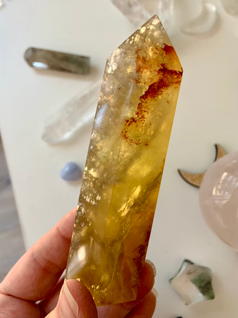 This deeply saturated Yellow Fluorite Tower is absolutely filled with shimmering mica with rare cubic phantom formations running vertically up the point, plus a fiery golden healer inclusion at the tip + some flashy rainbows too.