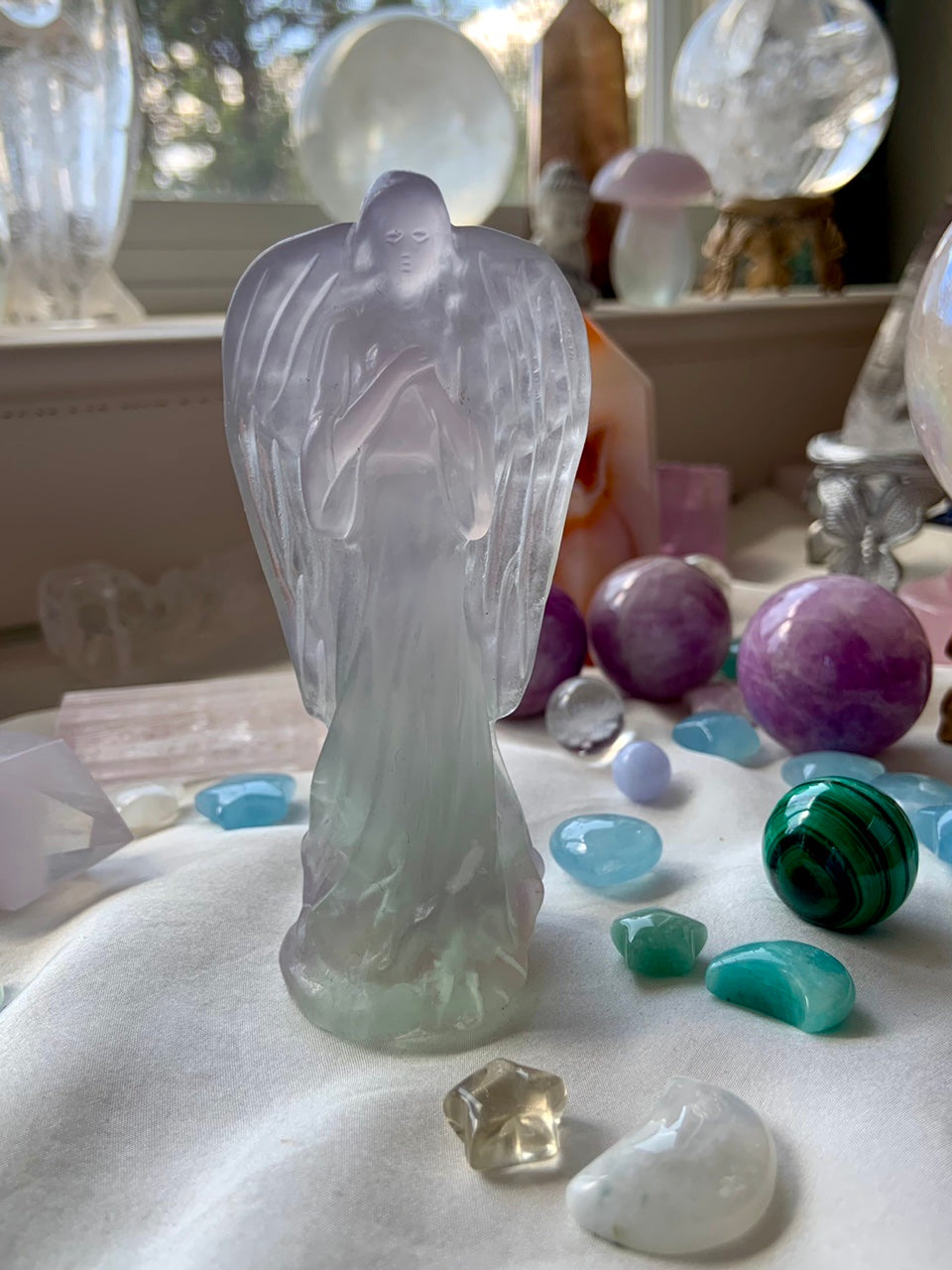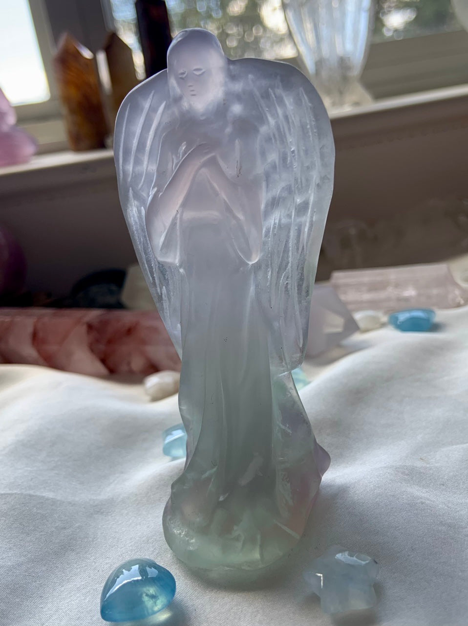 A lovely heirloom quality collector's piece, this Yttrium fluorite angel holds her hands over her heart + lovely details in the her wings. Sweet angelic crystalline energy glows from this hand carved angel figurine, bringing a nurturing, protective energy to your space, sweetly emanating her divine loving energy.