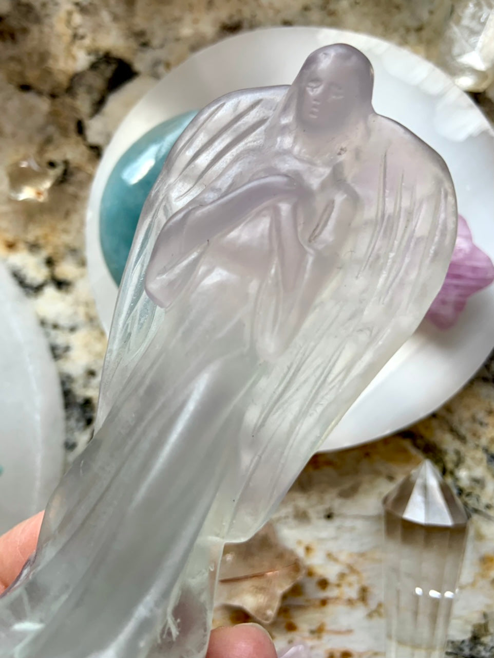 Yttrium Fluorite Angel Carving with Scolecite Inclusions