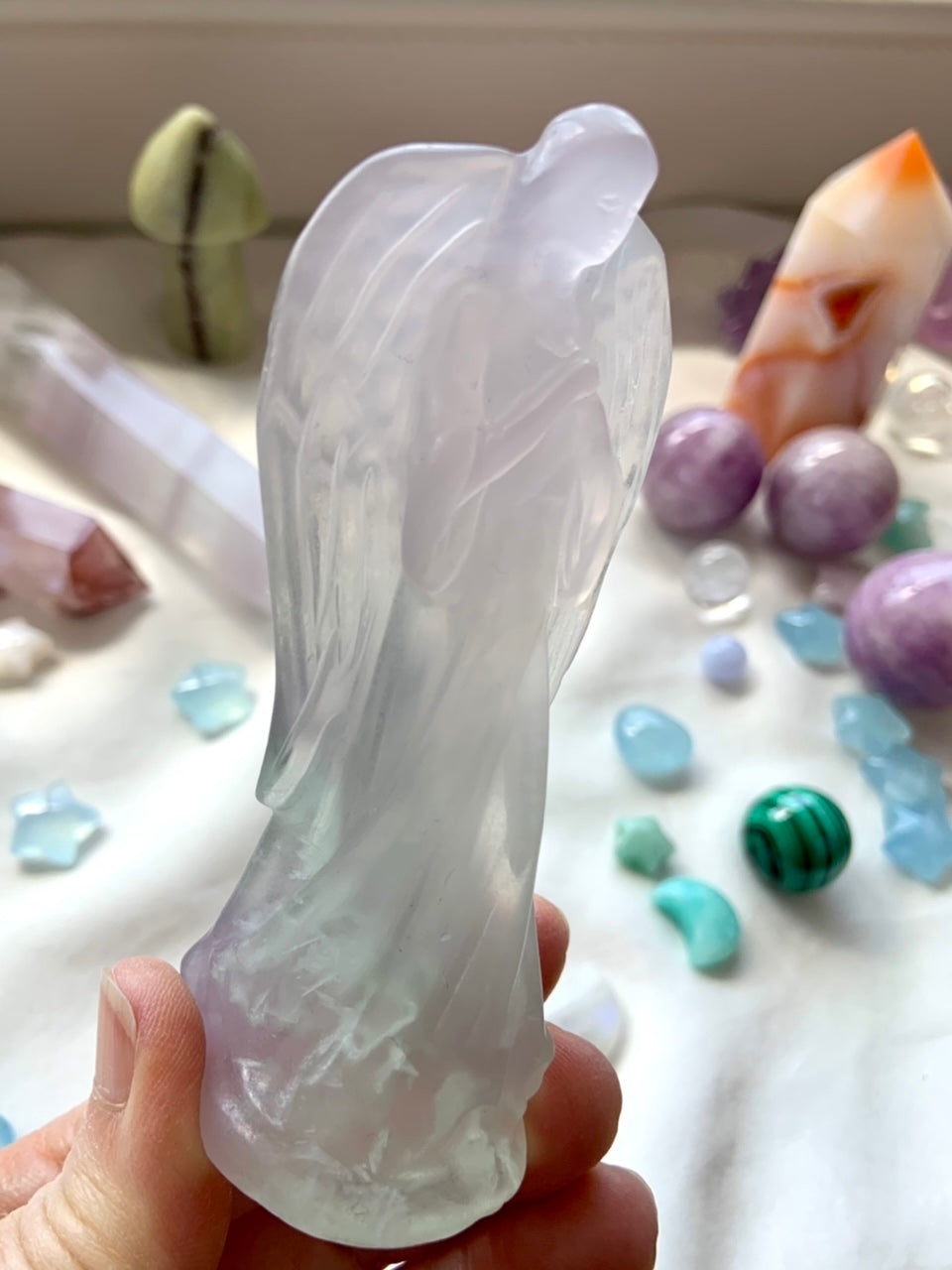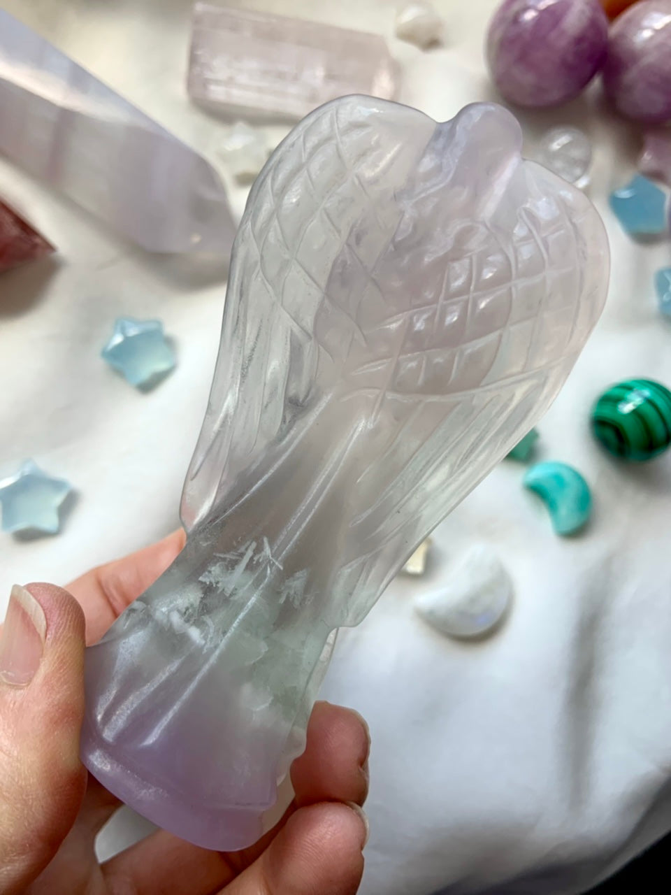 This luminous crystal angel figurine is hand carved from the most lovely pastel Yttrium Fluorite with a soft ombre of lavender, clear + pale green running through the stone. There are some beautiful, wing-like Scolecite inclusions at the base which add to the angelic energy.