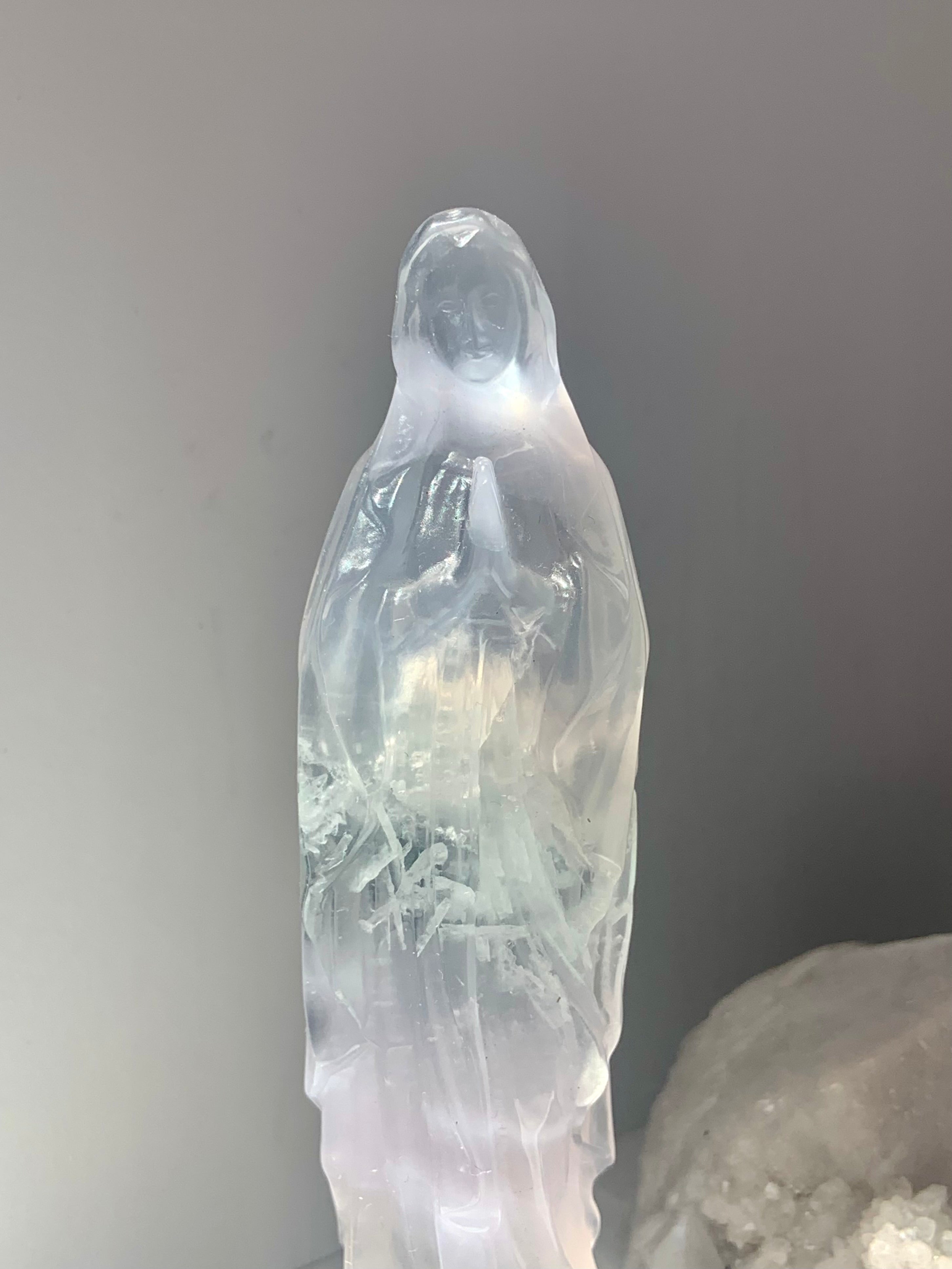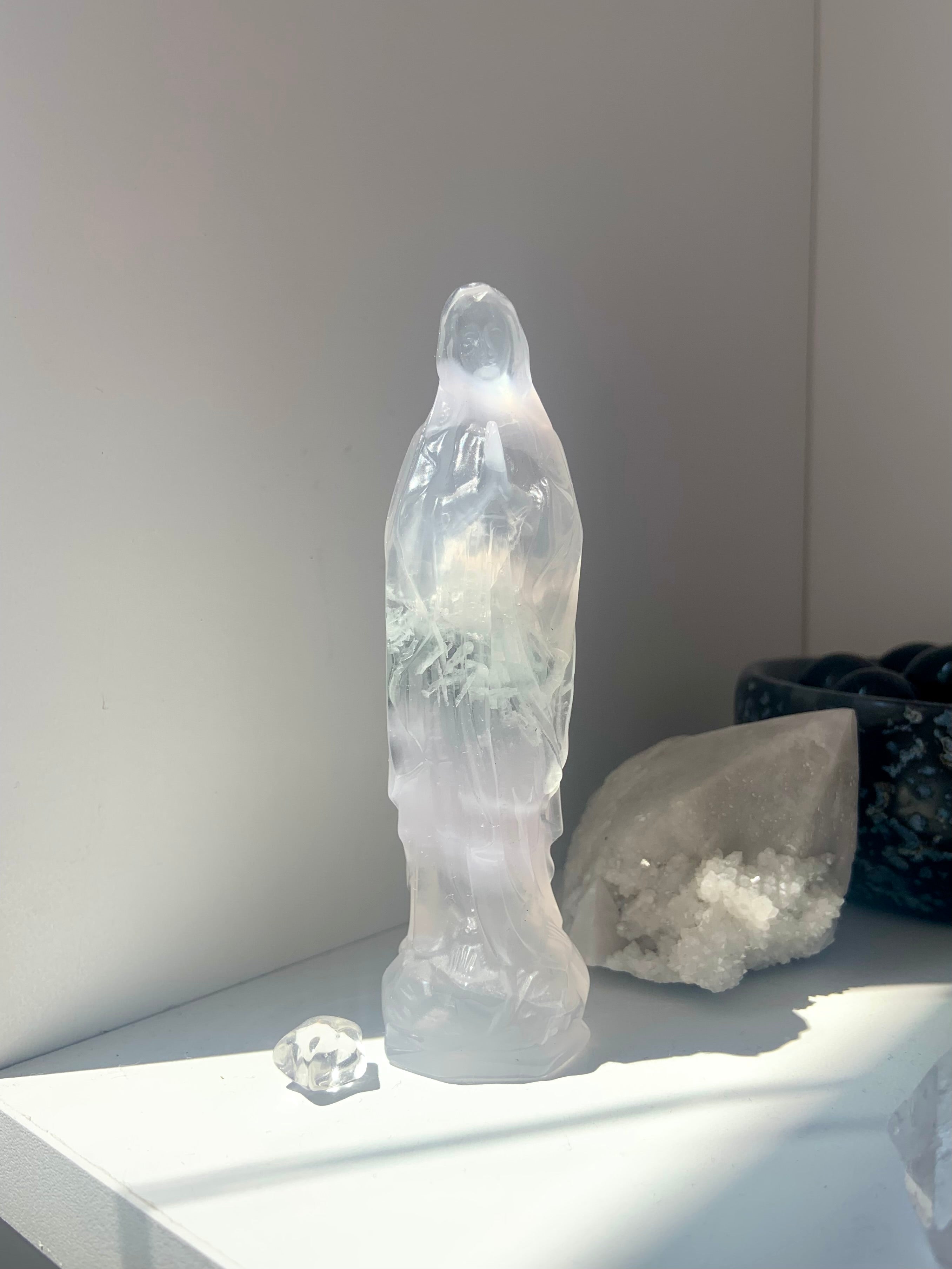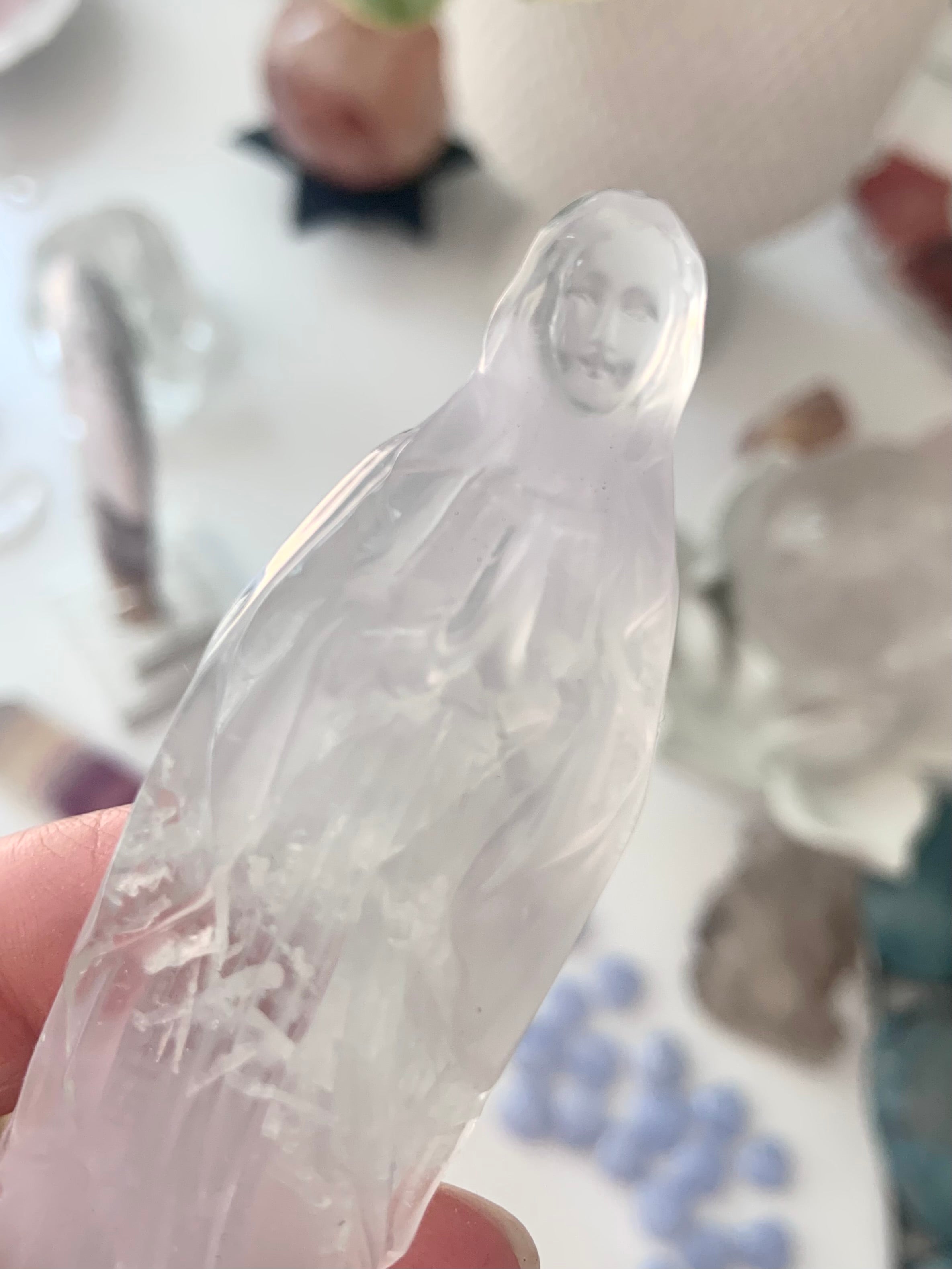Use this special figurine to commune with Mother Mary. Mother Mary can offer guidance + protection on your deeper healing work, when you call in your angels, spirit guides, and/or come into alignment with your Highest Truth. Allow this Divine Mother figurine to serve as your shining light, to illuminate the destiny of your Divine Calling. Meditate with it, infuse it with your love + program it's crystalline structure as your protector, a symbol of divine guidance for your highest good + the highest good of all. If you're gifting this beauty you can program it with this method for another person as well.