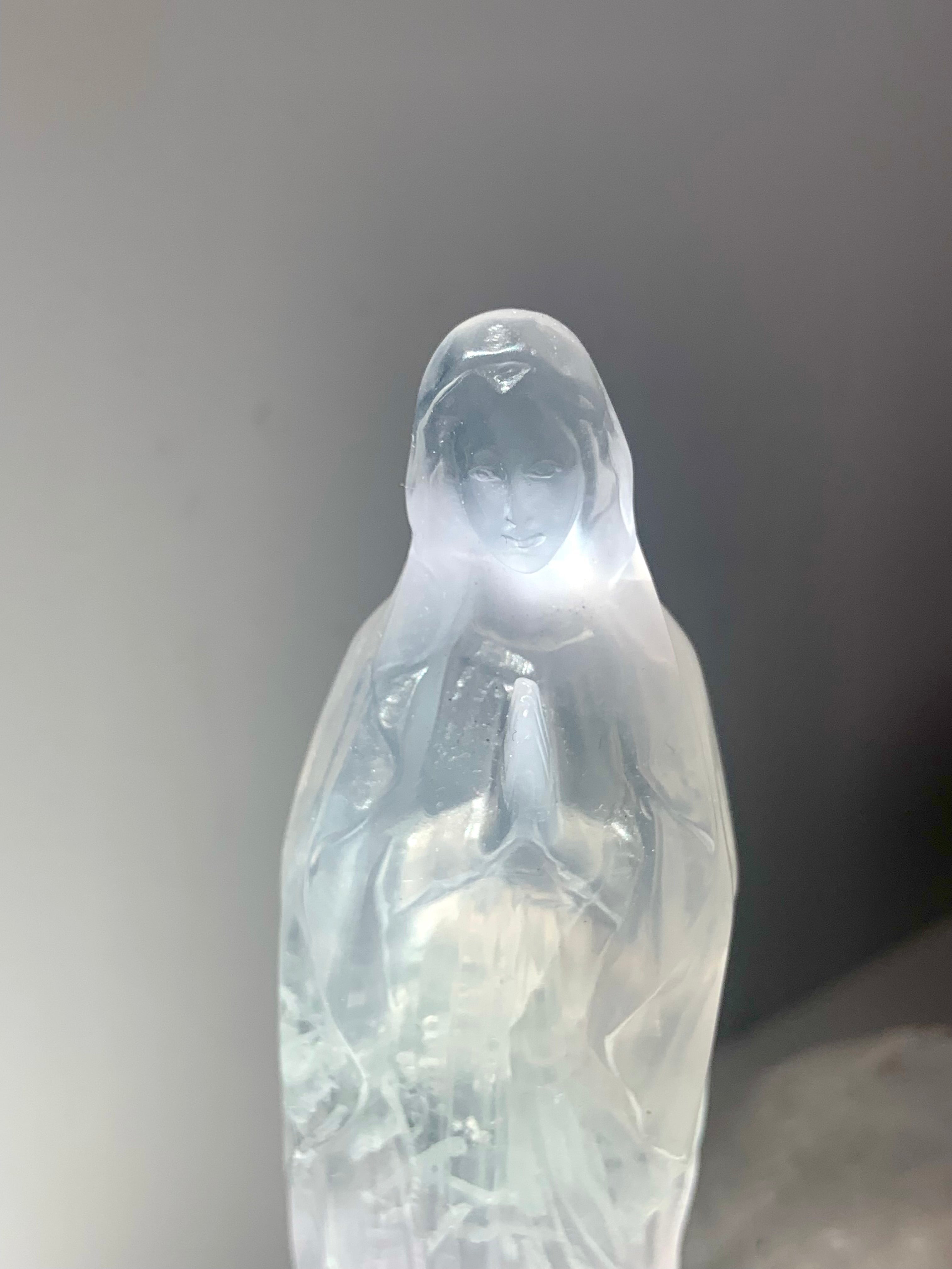 This luminous crystal Mother Mary figurine is carved from the most dreamy transparent lavender colored Yttrium Fluorite. A rare + lovely collector's piece, this Yttrium Fluorite Mary holds her hands in prayer position over her heart.