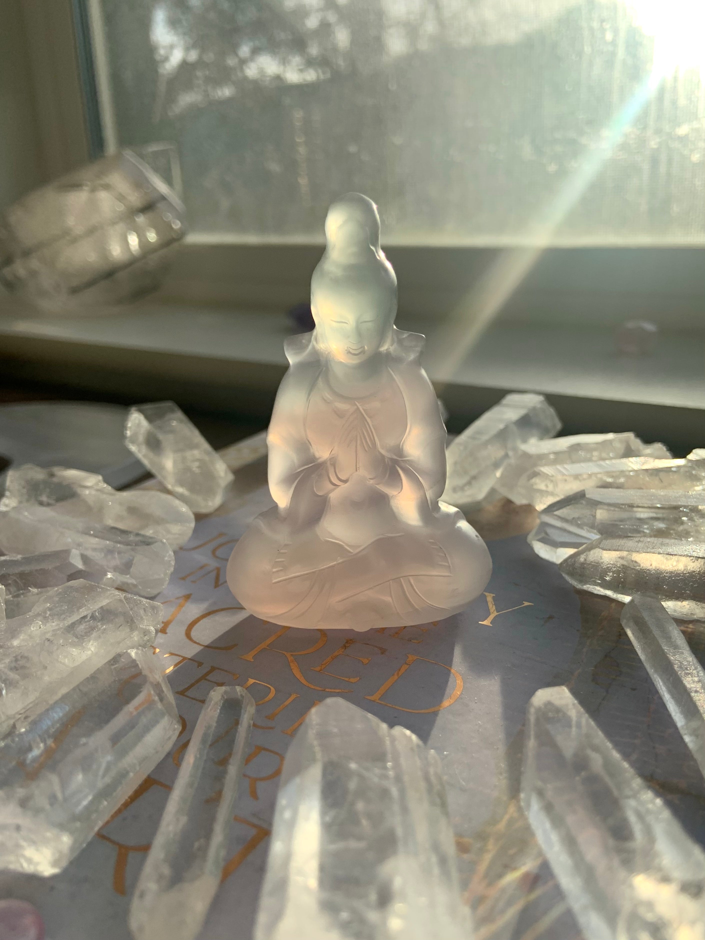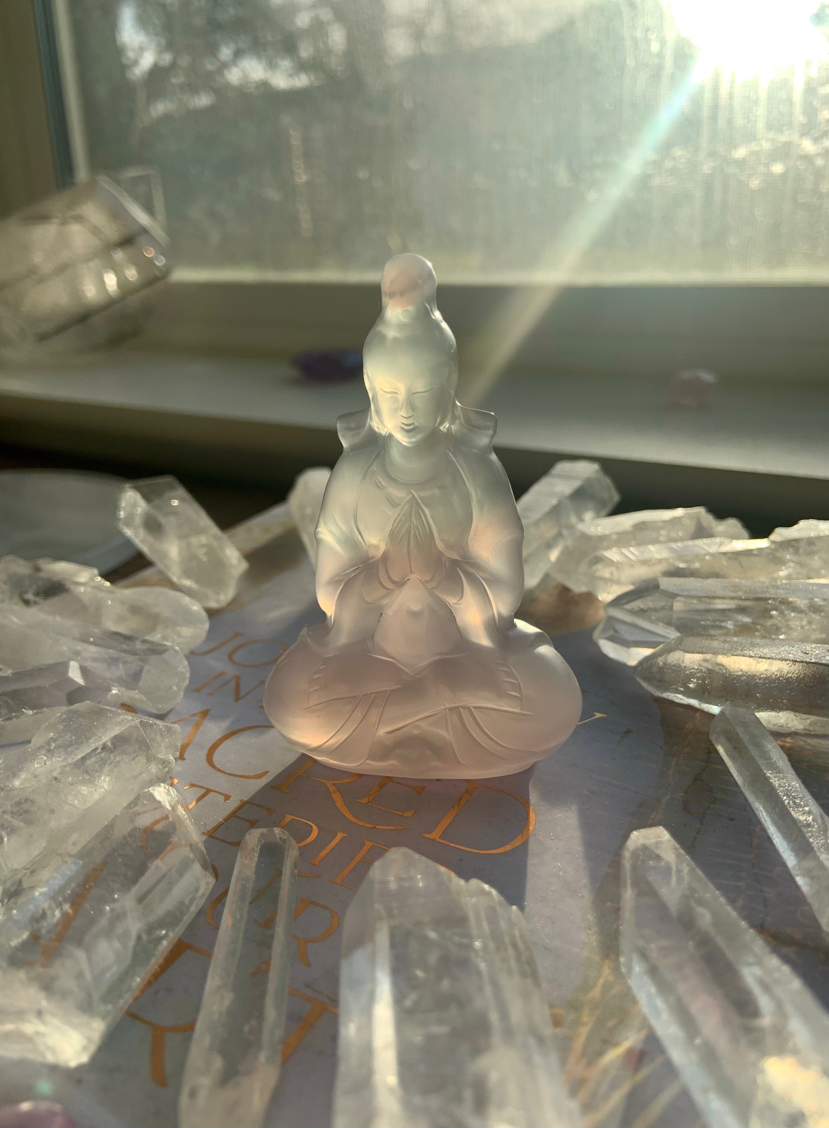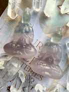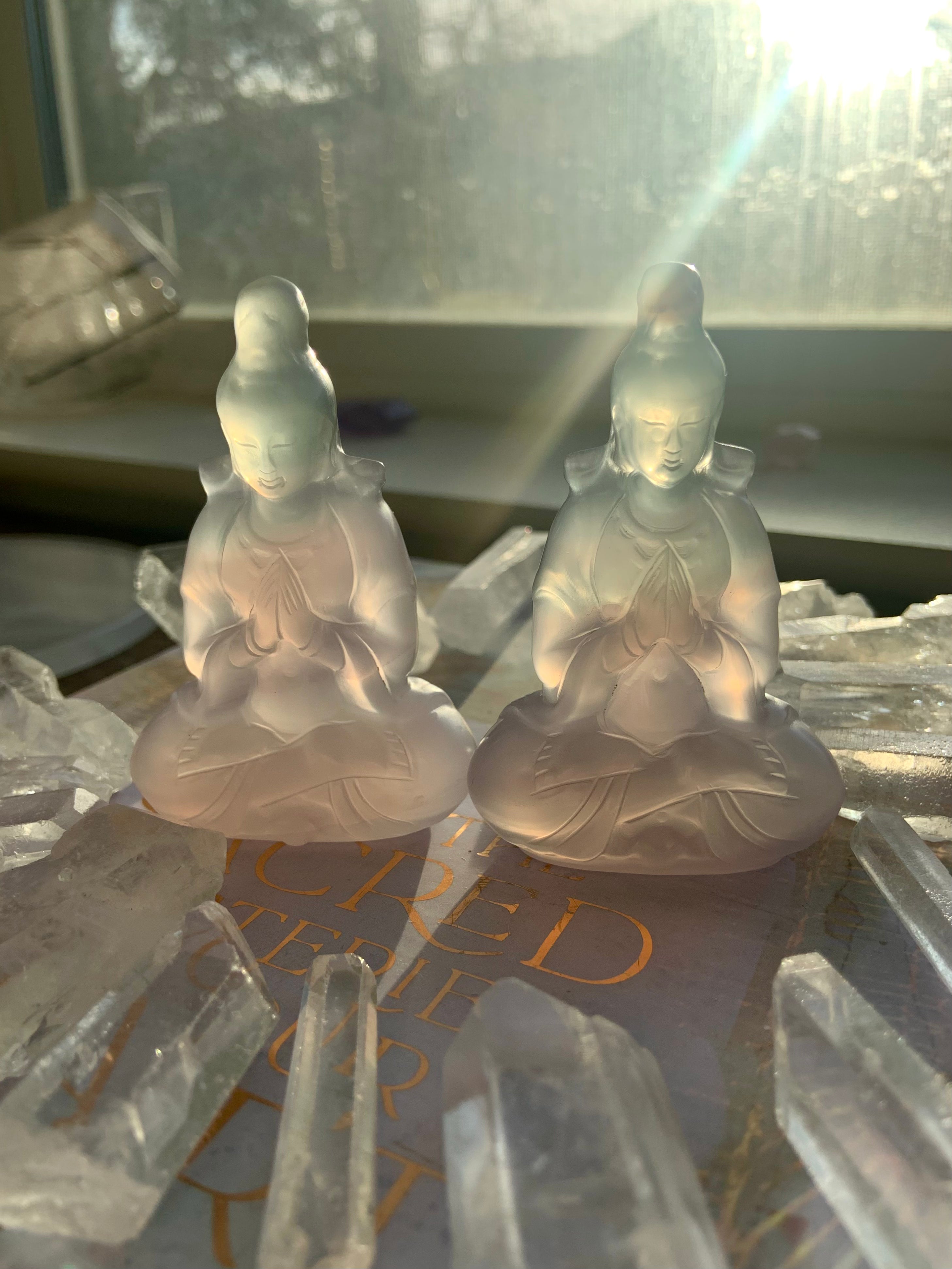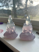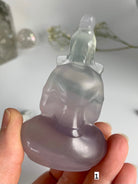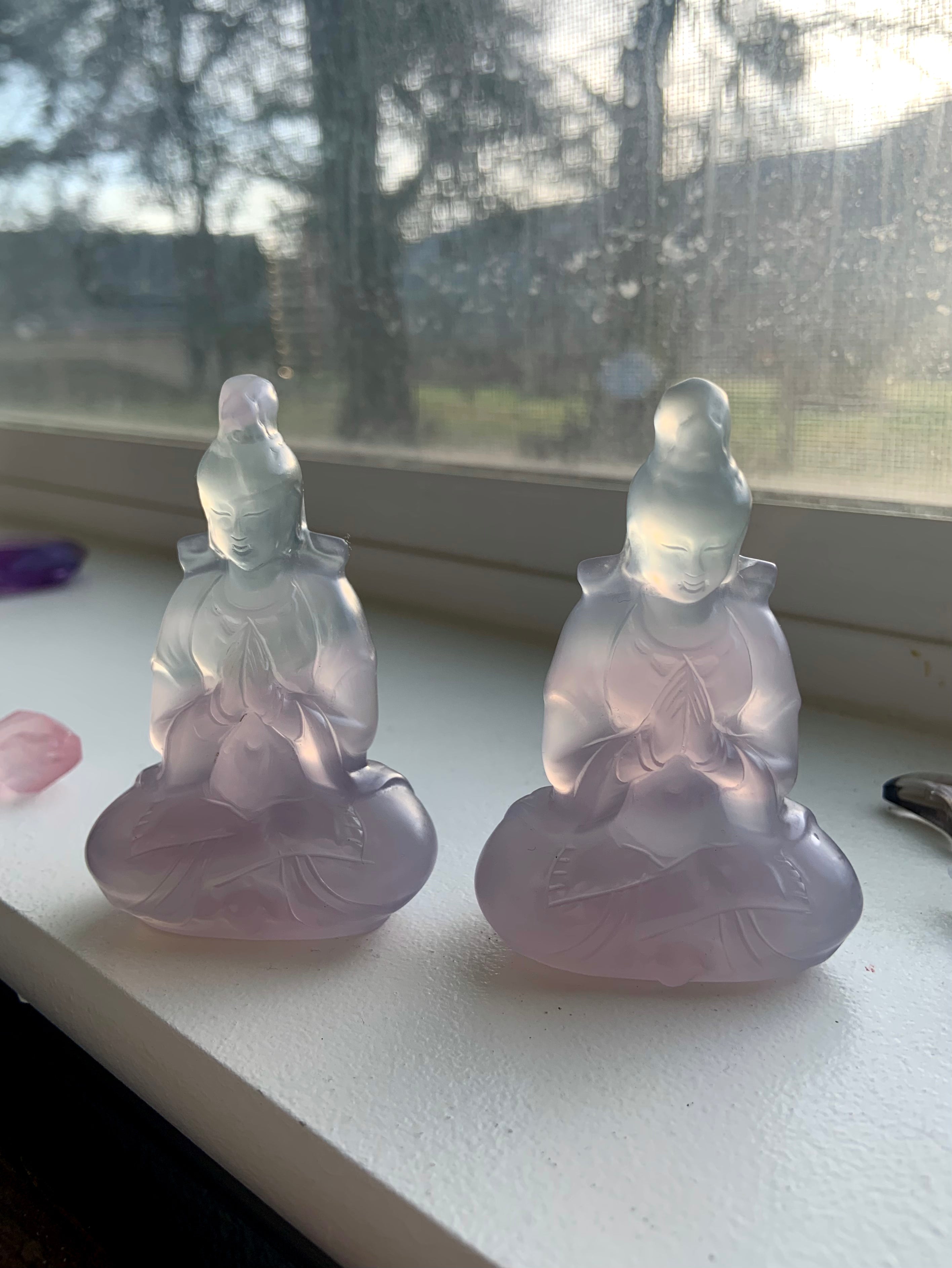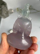 Bring a crystal Quan Yin carving in to elevate your sacred space. Beautifully carved out of transparent lavender + green fluorite, these crystal goddesses are simply divine.