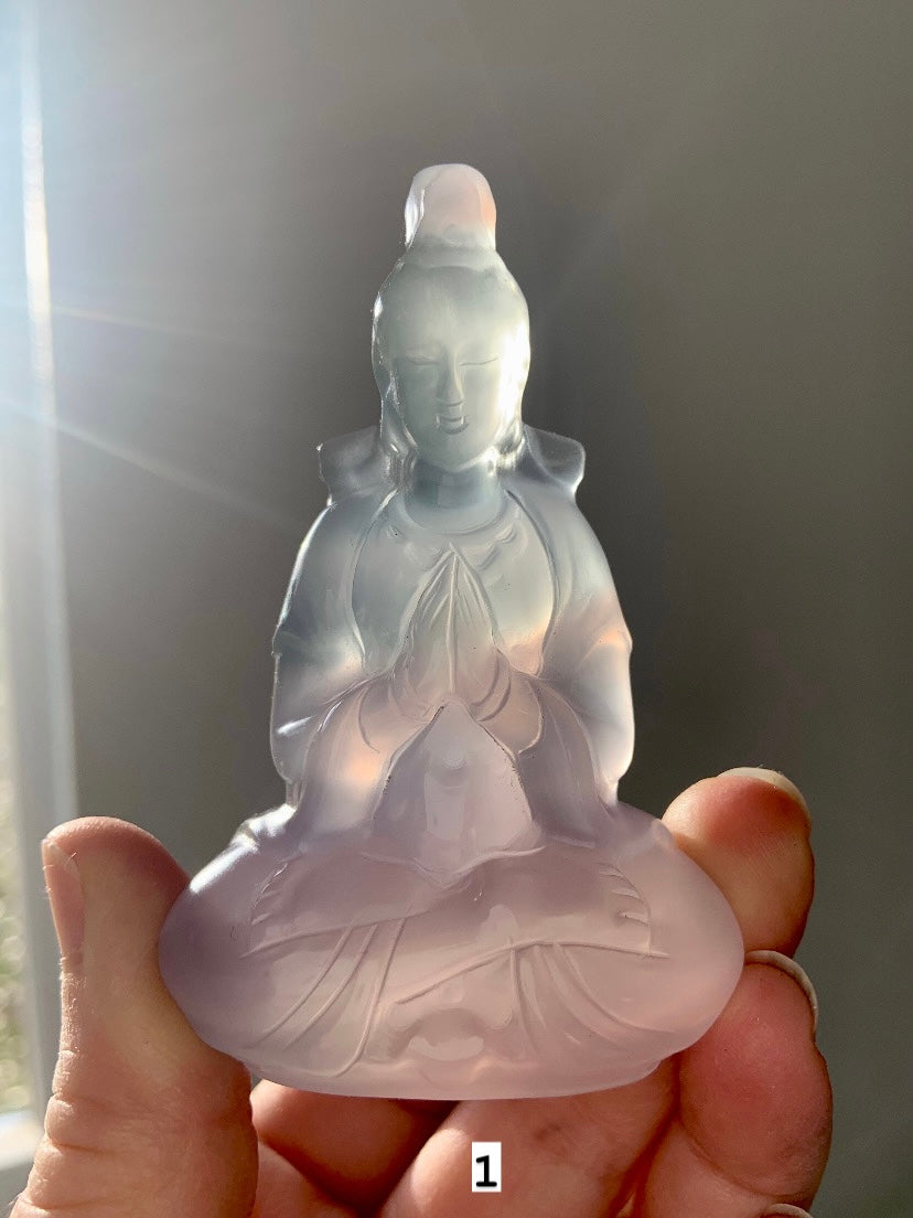 This luminous pastel fluorite is lovingly carved into the shape of Quan Yin, our Lady of Compassion meditating with her hands in prayer position. This sweet crystal goddess statue glows, bringing a nurturing, protective energy to your space, sweetly emanating her divine loving energy.